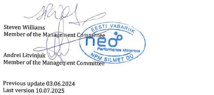 - In May 2024, NPM Silmet has developed and trained commercial employees on the following: “Non-conflict minerals and supporting procedures” that covered the requirements of the EICC Code of Conduct, the OECD (2016) Due Diligence Guidance for Responsible Supply Chains of Minerals from Conflict-Affected and High-Risk Areas (third edition), and the Supply Chain Transparency Smelter Audit Protocol for Tin and Tantalum (Rev. 21st of November 2013) (OECD Guidance).